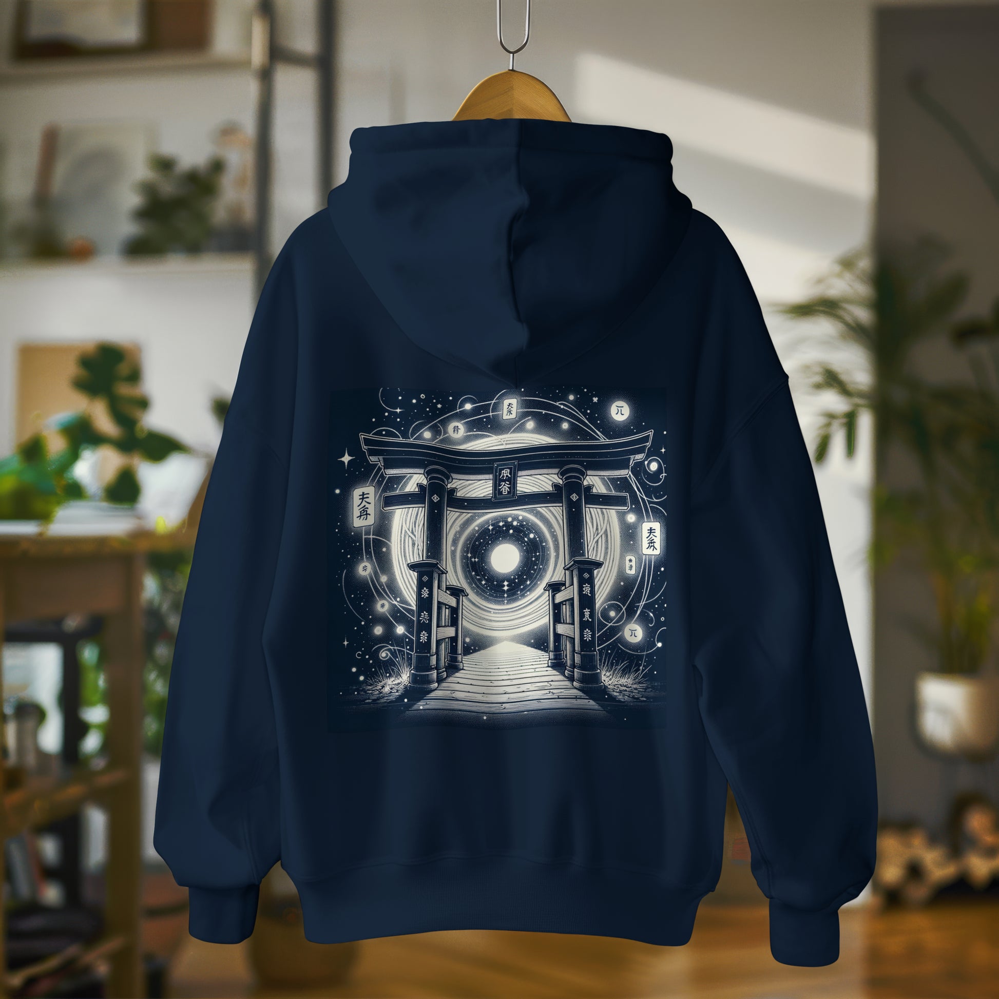 Enter the realm of shadows and stars. The Torii Gate hoodie evokes the silence between galaxies, where tradition meets the unknown. Featuring a sacred torii gate opening into a swirling cosmic vortex, this design honours mystery, movement, and the infinite cycles of time.